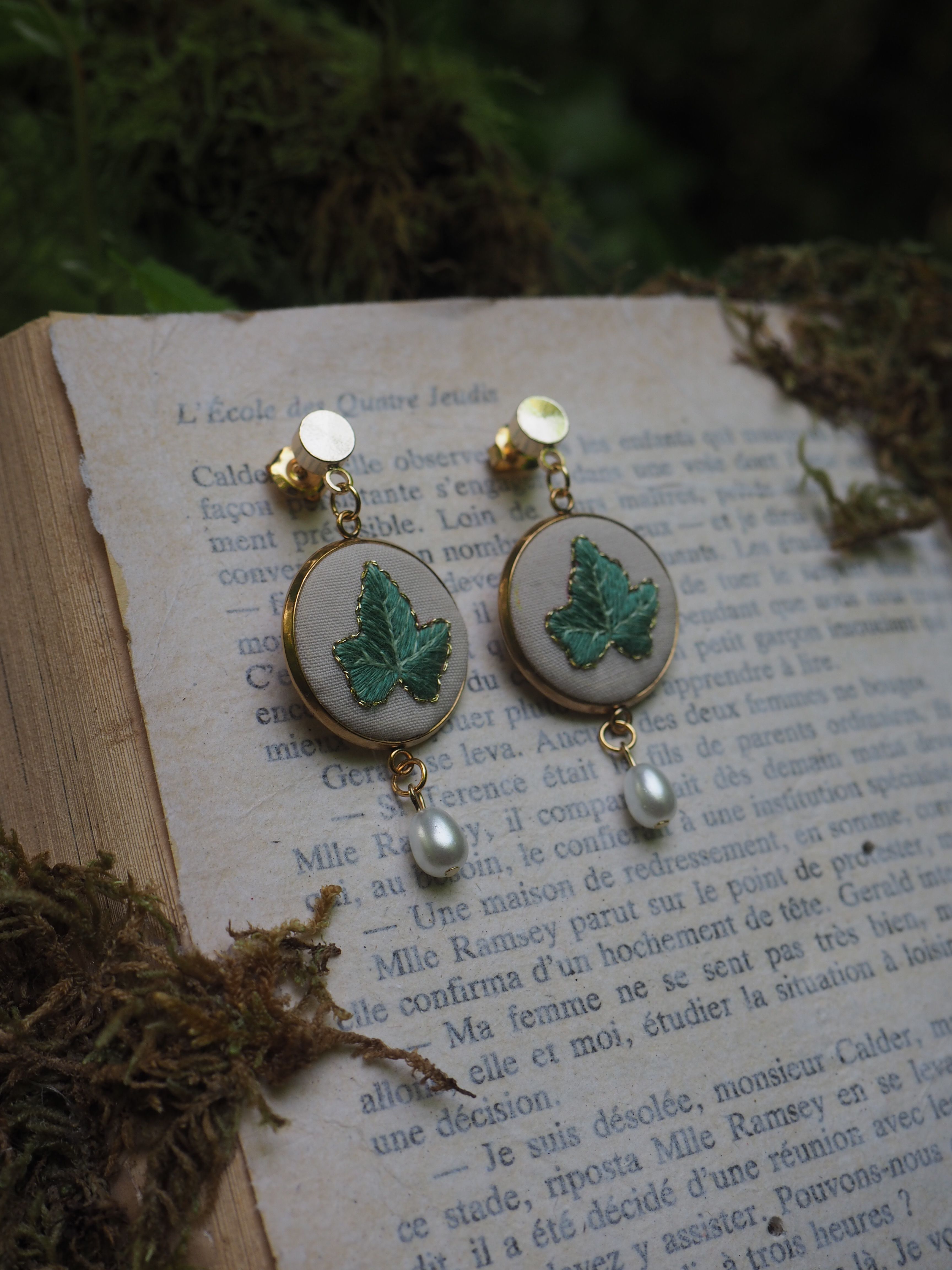 42 €Apportez une touche de poésie végétale à vos tenues avec ces boucles d’oreilles doré brodées à la main. Inspirées de la nature sauvage, chaque paire est une miniature textile précieuse, représentant délicatement deux feuilles de lierre, symbole de fidélité et de lien éternel.