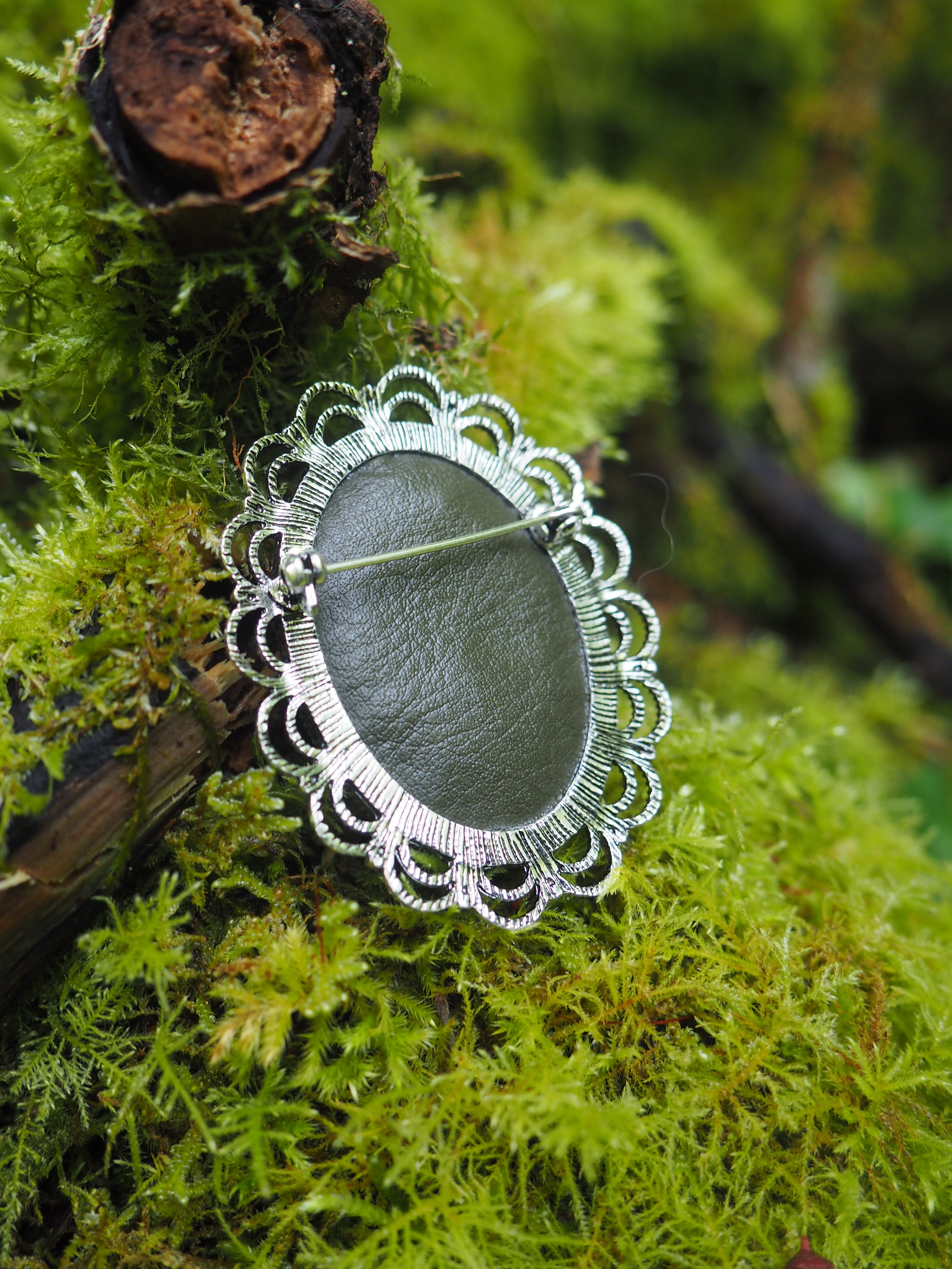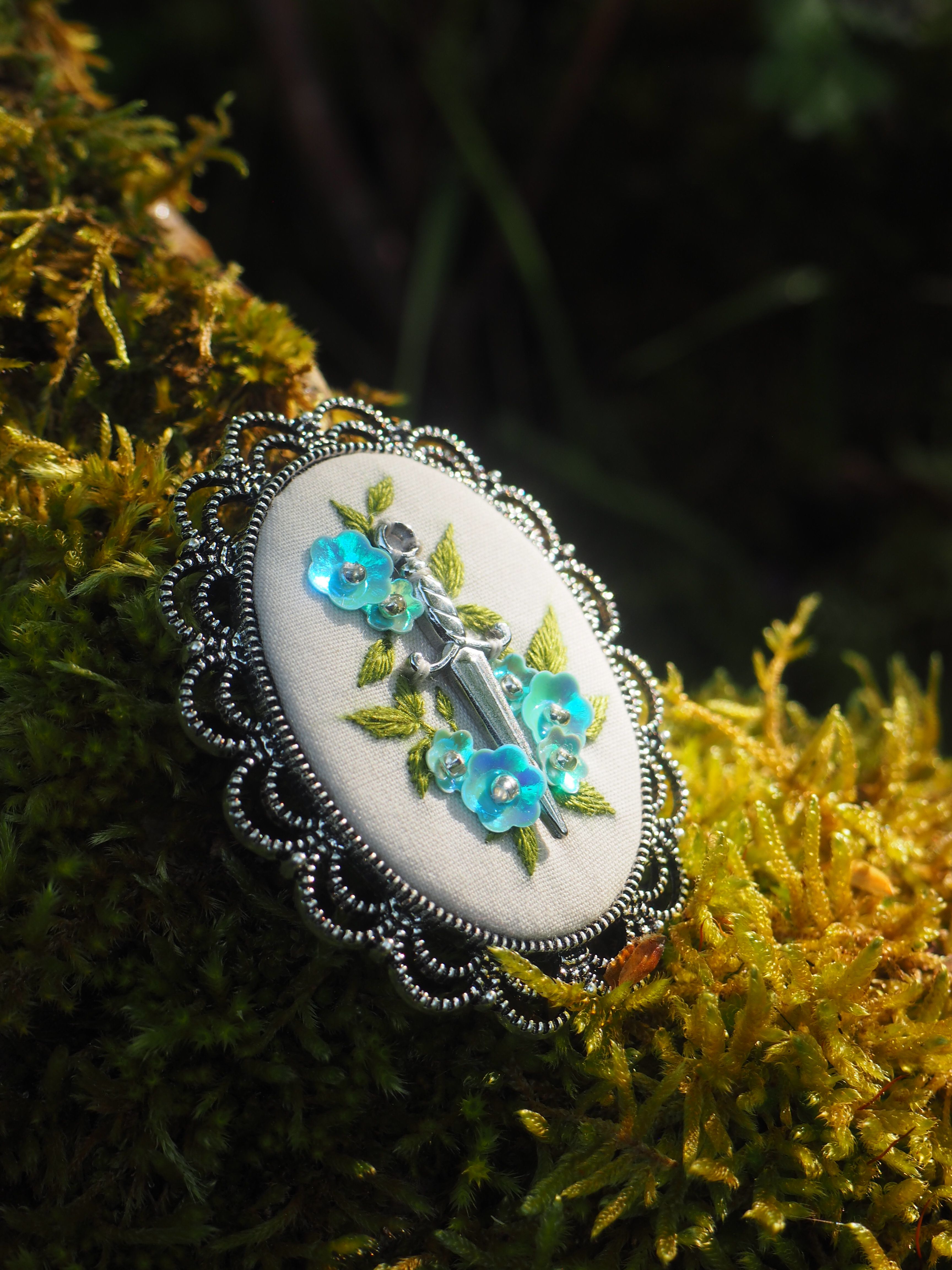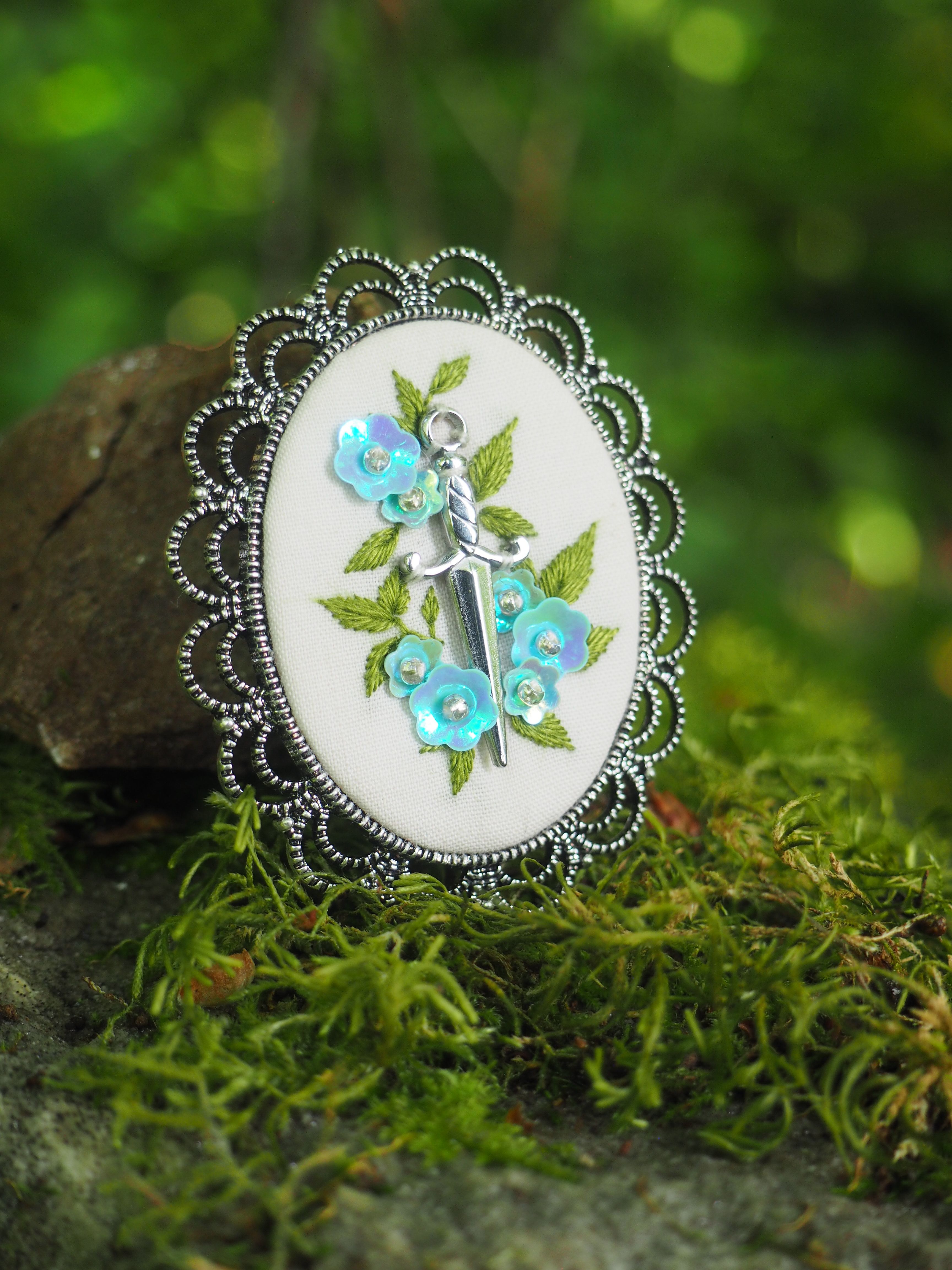 Chaque fleur est minutieusement brodée sur un tissu de coton upcyclé, dans une démarche écoresponsable. Le tout est mis en valeur par un médaillon de 50 x 40 mm, au cadre finement travaillé, pour une touche résolument romantique et chevaleresque.